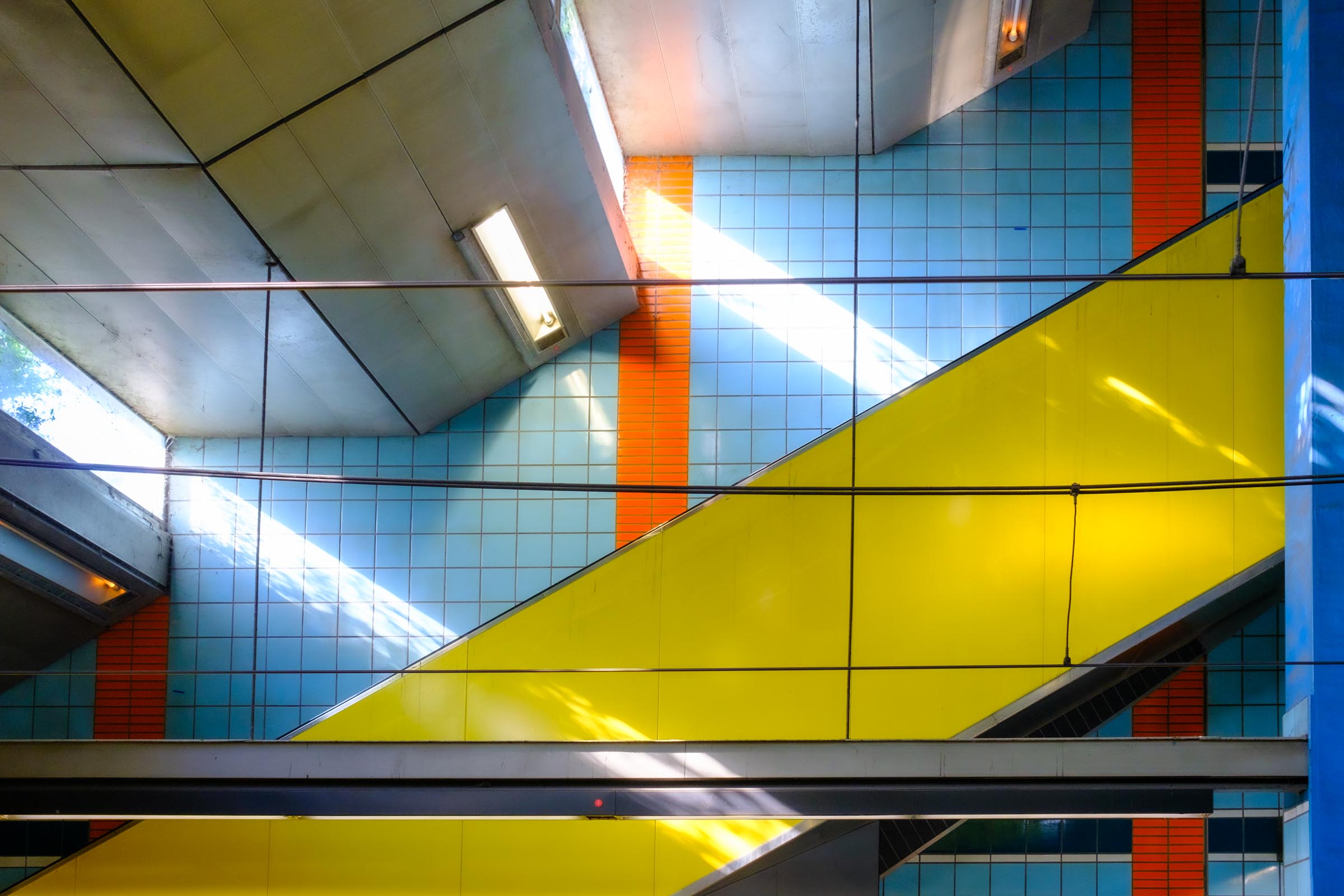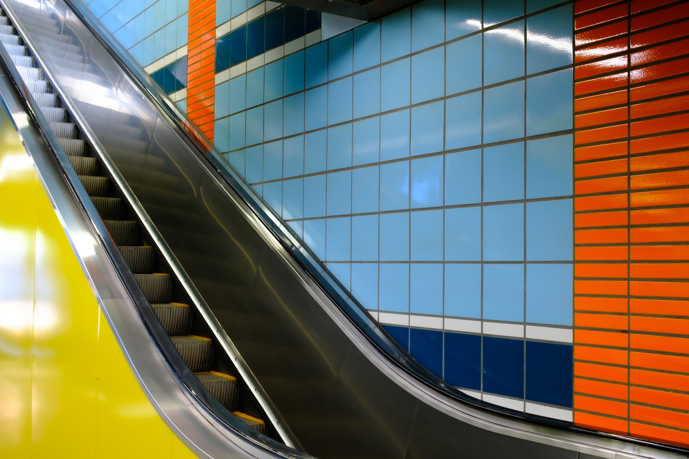 Hier sind zwei Stationen abgebildet. Einmal Station Geldernstraße und einmal Leyendeckerstraße. Alle Kölner Stationen besitzen eine jeweils individuelle Gestaltung. Die hier sichtbaren blauen und orange Kacheln und das Gelb der Verkleidungen tauchen in verschiedenen Stationen auf.