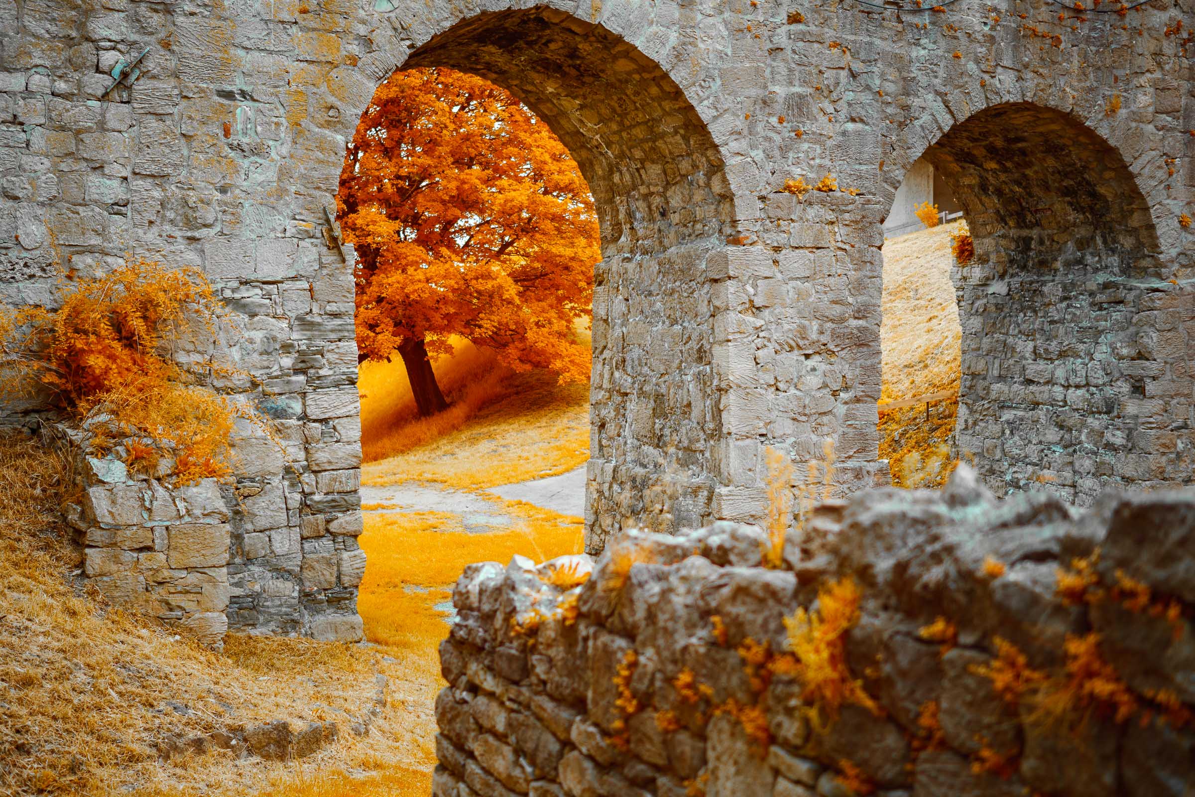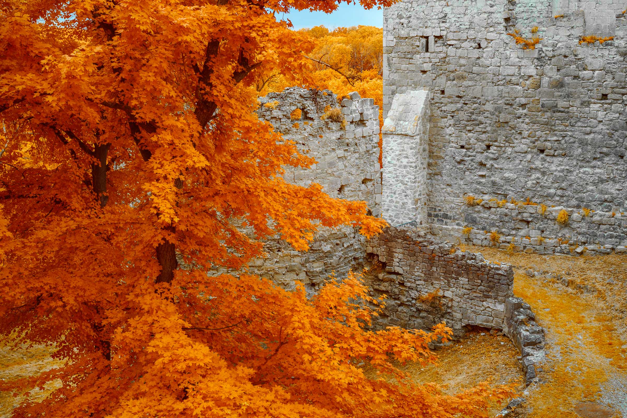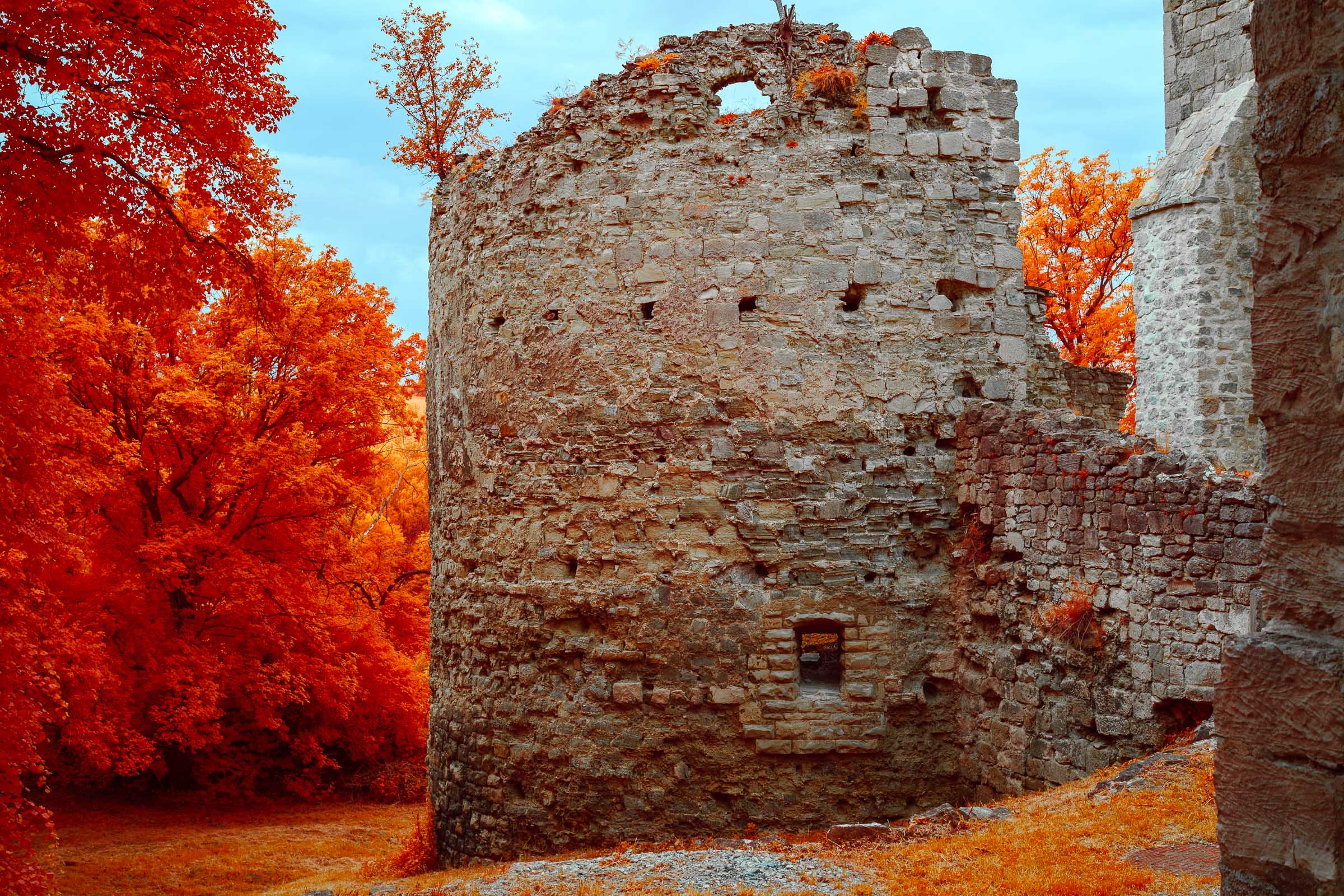Hier erstrahlt die mittelalterliche Raubritterburg mit Namen Rudelsburg im vollen Infrarot-Glanz. Was im Foto wie ein wunderschöner Herbsttag aussieht, habe ich im Mai des Jahres 2024 mit meiner Infrarot-Kamera und einem Kolari IR Chrome Filter aufgenommen. Sattgrün verwandelt sich damit in leuchtendes rot-orange.