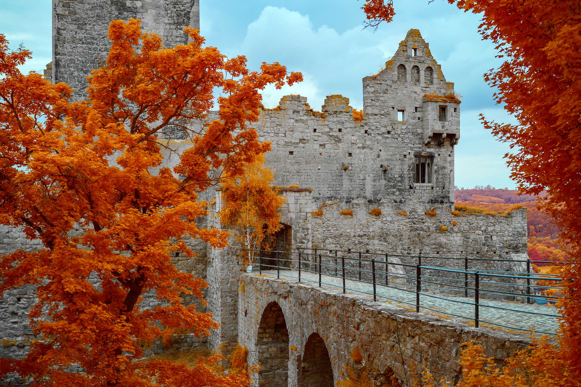 Hier erstrahlt die mittelalterliche Raubritterburg mit Namen Rudelsburg im vollen Infrarot-Glanz. Was im Foto wie ein wunderschöner Herbsttag aussieht, habe ich im Mai des Jahres 2024 mit meiner Infrarot-Kamera und einem Kolari IR Chrome Filter aufgenommen. Sattgrün verwandelt sich damit in leuchtendes rot-orange.