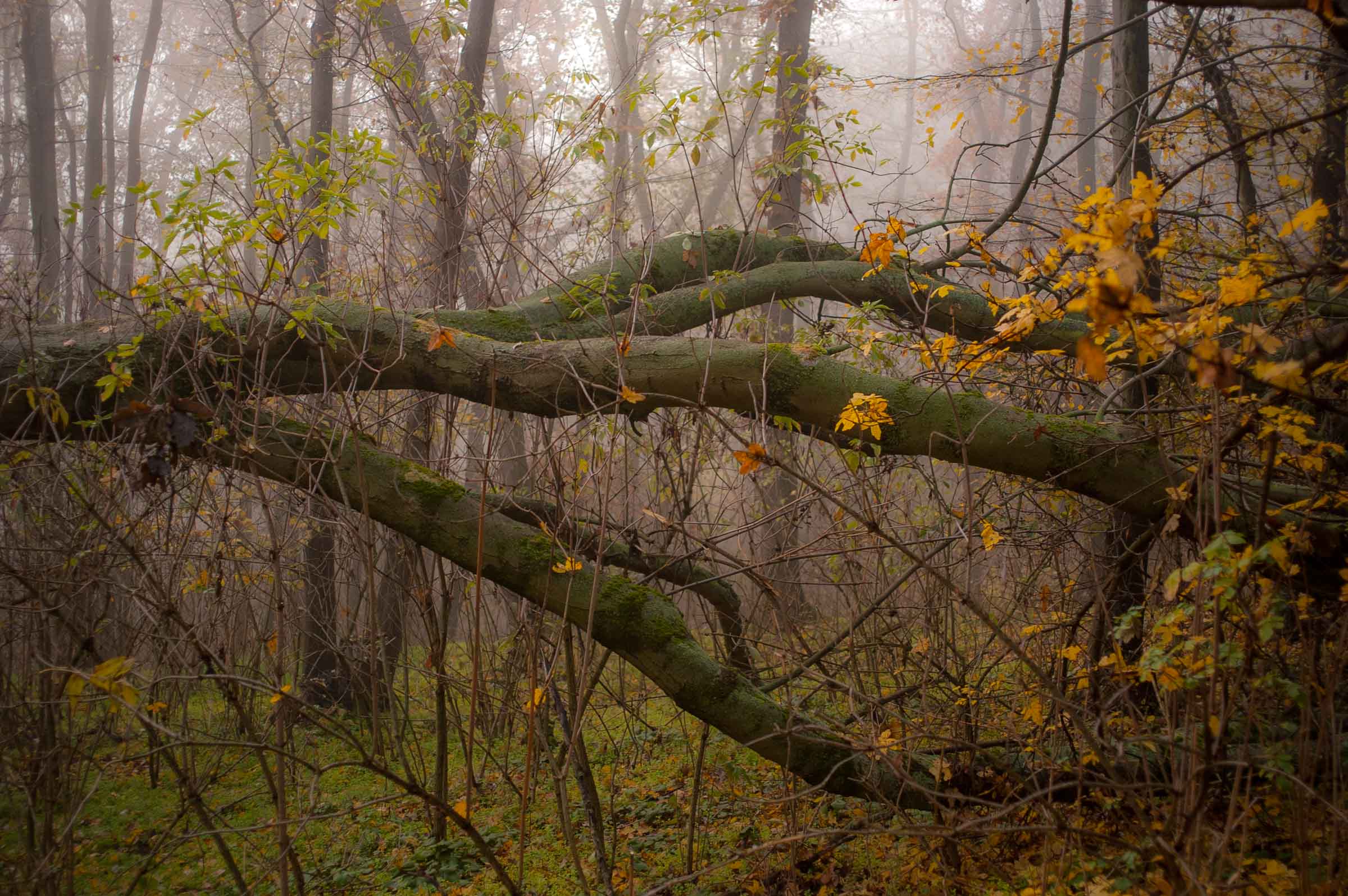 During an autumn walk, moody views presented themselves in November. The forest has cleared after many leaves have already fallen down. The leftover leaves were autumnally colored. The dew was on the meadow and a fine fog veil connected all these elements wonderfully with each other.
