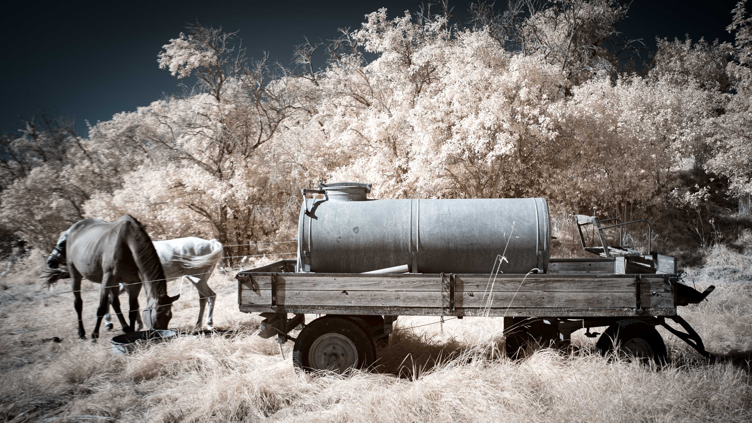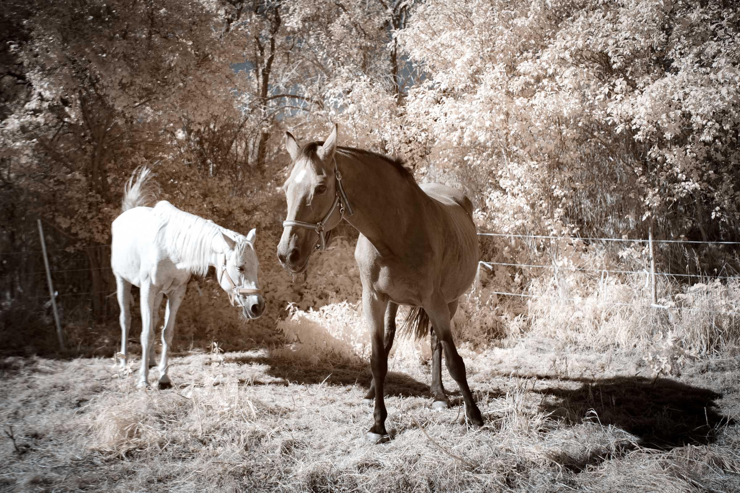 During a walk, two horses stood next to their trench on the side of the road. I had my infrared camera with me, because the weather was really perfect for infrared images. The sky was clear and the beautifully strong autumn sun was already a little lower in the sky.